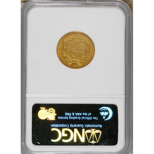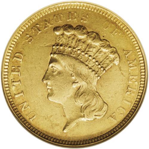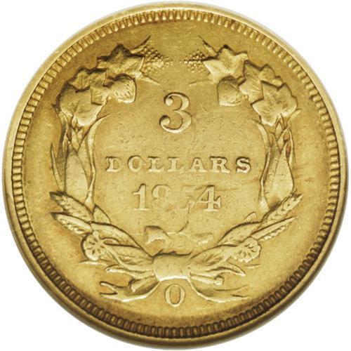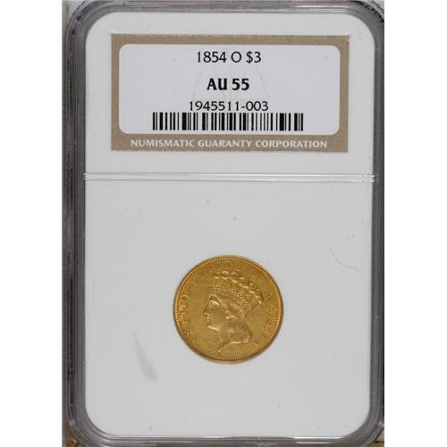 <B>1854-O $3 AU55 NGC.</B></I> The 1854-O three dollar pieces were placed into circulation soon after they were struck (David Bowers and Douglas Winter, 2005). Most of the certified population is in the XF to AU grade range, while Mint State coins are elusive. Apricot-gold patina enriches both sides pf this Choice AU specimen, and the design elements reveal good detail, except for weakness in the 85 of the date. A few minute marks occur on each side.<BR><BR><b>Shipping:</b> Coins & Currency (<a target="_blank" href="http://www.heritageauctions.com/common/shipping.php">view shipping information</a>)