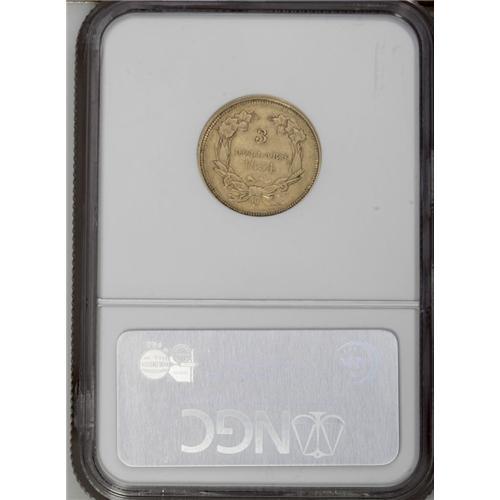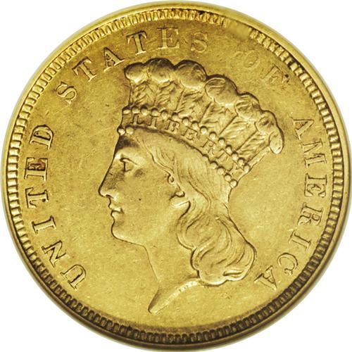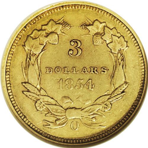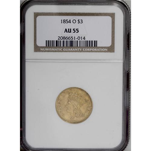 <B>1854-O $3 AU55 NGC.</B></I> This lightly circulated and original first-year New Orleans example has blended apricot and olive-green toning. Obtrusive marks are absent. Since Mint State examples are extremely rare, the present piece will serve as a suitable and collectible substitute.<BR><BR><b>Shipping:</b> Coin/Currency (<a target="_blank" href="http://www.heritageauctions.com/common/shipping.php">view shipping information</a>)