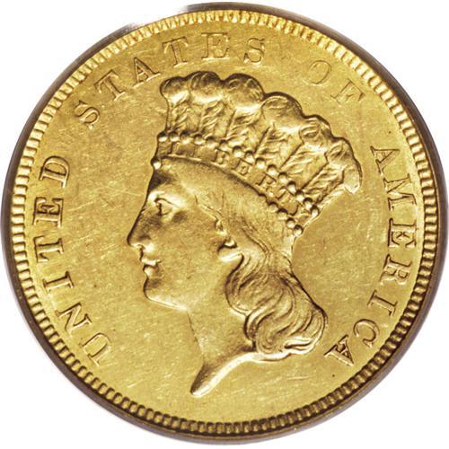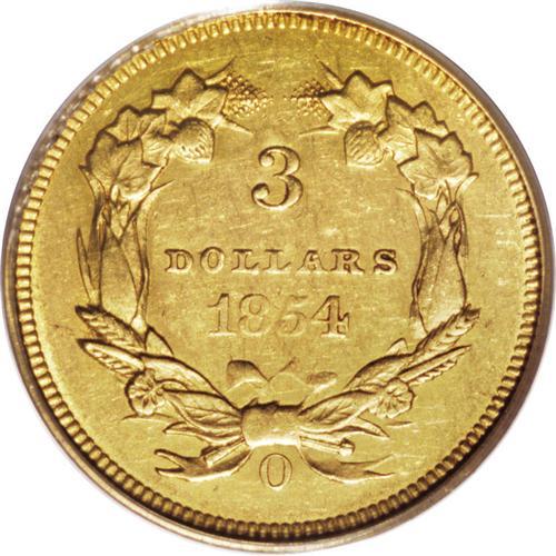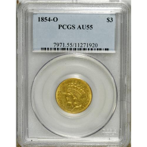 <B>1854-O $3 AU55 PCGS.</B></I> In this first year of production for the three dollar denomination, coins were struck in Philadelphia, Dahlonega, and New Orleans. The two branch mint issues each represented the only production of this denomination at their facilities. The New Orleans Mint produced 24,000 of these coins in 1854, a quantity sufficient that survivors can still be located without undue difficulty. Of course, collector demand for these coins is high, with both date and type collectors seeking examples. This Choice AU example is a pleasing representative with light greenish yellow-gold surfaces on both sides. These surfaces have minor blemishes that are consistent with the grade.<BR><BR><b>Shipping:</b> Coins & Currency (<a target="_blank" href="http://www.heritageauctions.com/common/shipping.php">view shipping information</a>)