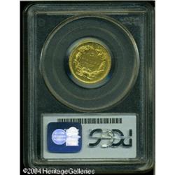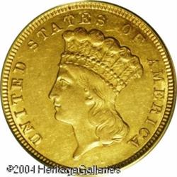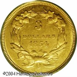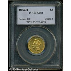 1854-O $3 AU55 PCGS. The key to a denomination set <B>1854-O $3 AU55 PCGS.</B></I> The key to a denomination set of New Orleans gold, the low production of 26,000 pieces and its status as the only O-mint issue of the type further underscore the significance of this high grade offering. The lemon-tinged surfaces are refreshingly unabraded. What at first glance appears to be a curved mark near the chin is in fact a mint-made clashmark from the lower inner border of the right side of the wreath. Liberty's profile is also apparent inside the wreath. Friction on the left edge of the hairline and on Liberty's eyebrow denies a finer grade, but luster percolates within the legends and devices. <BR><BR><B>Important notice:</B> Heritage usually auctions material at the rate of 200-250 lots per hour. On some occasions eBay Live bid software or the Internet may not be able to keep up with the pace of the auction. We recommend placing a realistic absentee bid now as insurance to avoid disappointment. Occasionally the auctioneer may eliminate or reject an eBay Live bid, and the auctioneer may also reopen a lot after the close of the eBay live bidding (usually because we missed an audience bid), and may reject your bid even if it shows you as the winning bidder. By bidding via eBay Live, you agree that Heritage may award the lot to another bidder at its sole discretion under the circumstances described above or any other reasonable circumstances. Since eBay bids are not shown to us until we open the lot on the floor, we treat those bids just like floor bids. In most cases the floor responds before the eBay bid is presented to us, due to Internet lag time, so for consistency we have made it a policy that floor bids are always considered first over tie eBay live bids. Also please note that all Heritage lots purchased through eBay Live carry a 20% Buyer's Premium. Please make sure you read the Terms and Conditions before you bid. This lot is being auctioned in conjunction with a live floor auction by Heritage Galleries & Auctioneers. All final auction and invoice information will be supplied by Heritage Galleries & Auctioneers, and all other information should be considered preliminary. Lot:6598