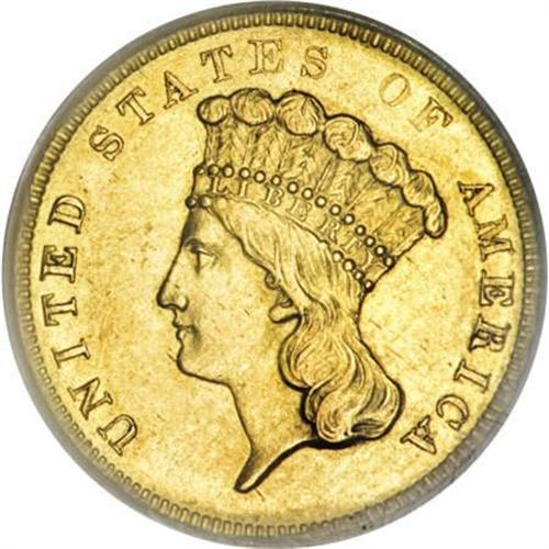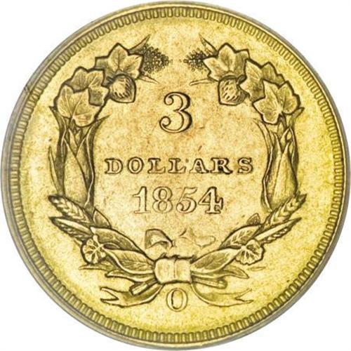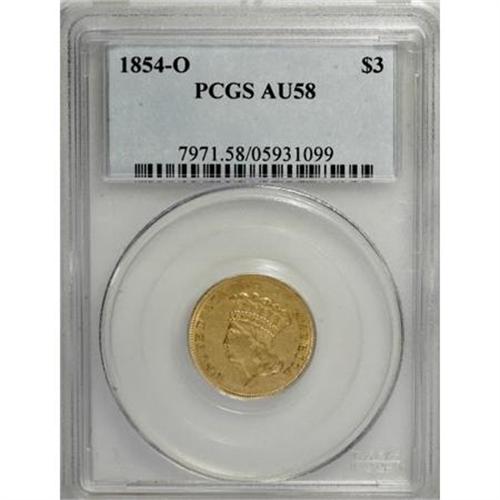 <B>1854-O $3 AU58 PCGS.</B></I> The 1854-O issue of three dollar gold is the only instance of this denomination being produced at the New Orleans Mint. This lightly circulated example displays essentially unabraded surfaces and satiny luster in the protected areas. Portions of the wreath ribbon are absent, as made from a lapped die. Modest highpoint wear is noted on Liberty's hair, between the ear and the crown. Faint hairlines are noted in the fields; mostly on the obverse. This piece appears to be from a later state of the dies, corresponding to what Winter refers to as his Variety Two. A highly attractive example that should stir considerable interest among three dollar gold and New Orleans Mint specialists. Population: 16 in 58, 2 finer (12/07). <BR><BR><B>Coin Engraver:</B> James B. Longacre<BR><BR><b>Shipping:</b> Coins & Currency (<a target="_blank" href="http://www.heritageauctions.com/common/shipping.php">view shipping information</a>)