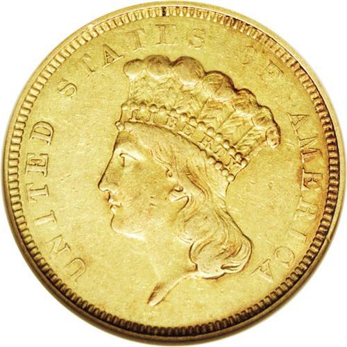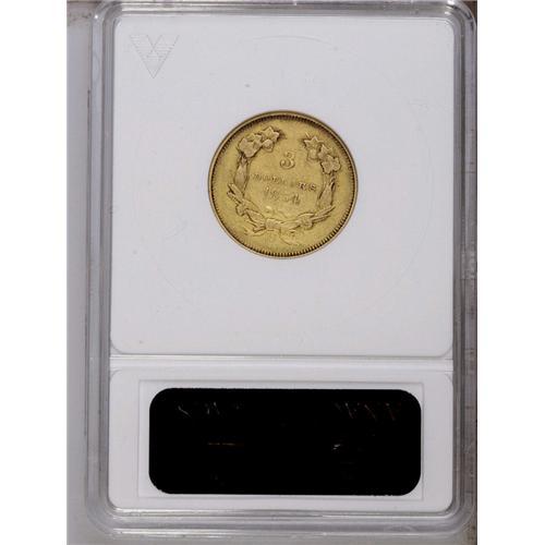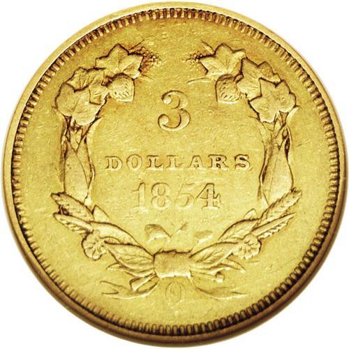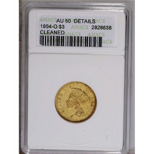 <B>1854-O<$3>--Cleaned--ANACS. AU50 Details.</B></I> A lightly hairlined olive-gold example that has a dash or two of orange toning here and there. The highpoints of the hair are worn, and a few letters in STATES OF are softly struck. The only New Orleans issue of the denomination. Scarce relative to its 1854 Philadelphia Mint counterpart.