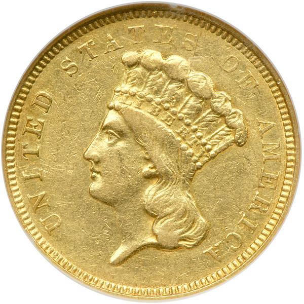 1854-O $3 Gold. NGC graded AU-55. Untoned. Only 24,000 struck. Popular as the only "O" mint $3.00 gold coin. For the date, a slightly frosty, pale golden AU with residual warm gold hints within the letters of the legends on both sides. No objectionable marks. Choice rims free of bumps and breaks in the denticles. Attractively struck as well, with just a hint of softness at STATES OF AMERICA as well as on the mintmark and ribbon bow of the wreath (PCGS # 7971) .