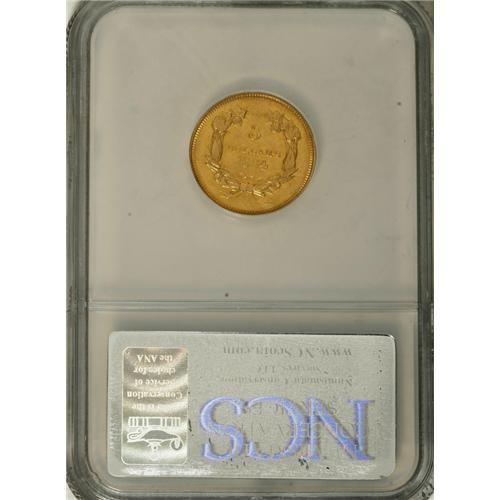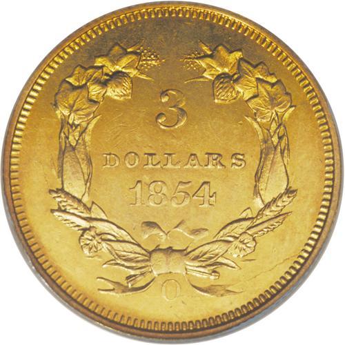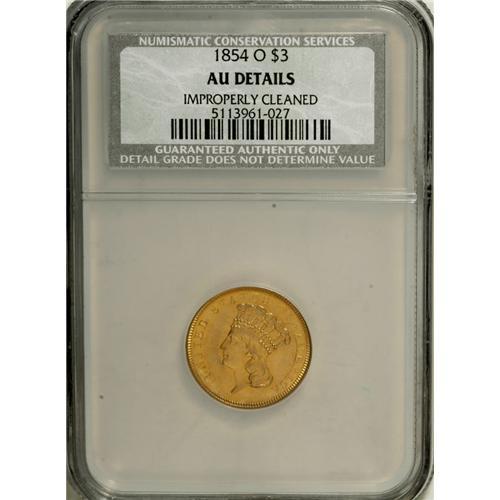 <B>1854-O $3 --Improperly Cleaned--NCS. AU Details.</B></I> It is too bad that this piece was improperly cleaned by someone, during the course of its history, because it is a pleasing example that displays substantial design details and a lack of distracting marks. Shallow planchet flaws (as struck) are noted between OF and AM on the upper obverse periphery. Fortunately, the past cleaning has had a minimal impact on the eye appeal of the piece, leaving it somewhat bright but otherwise unimpaired.<BR><BR><b>Shipping:</b> Coins & Currency (<a target="_blank" href="http://www.heritageauctions.com/common/shipping.php">view shipping information</a>)