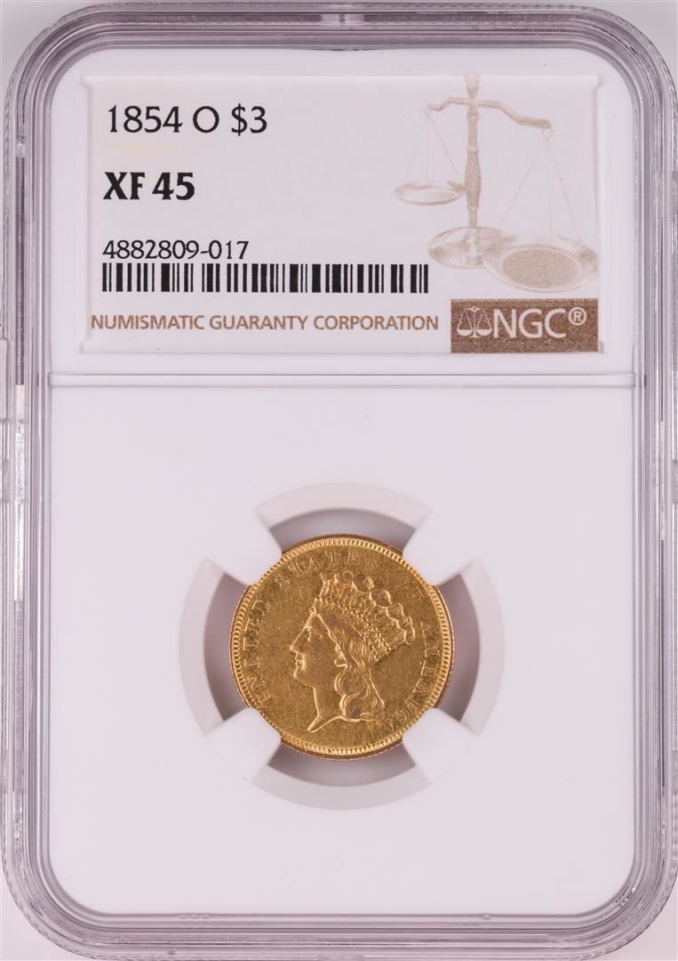 One 1854-O $3 Indian Princess Head Fold Coin NGC XF45. NGC Certified.