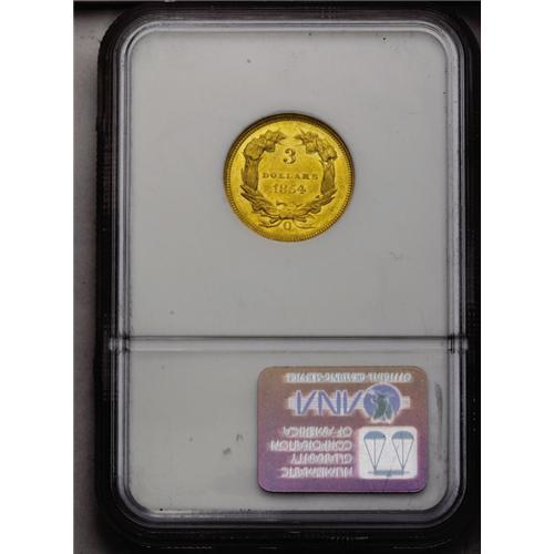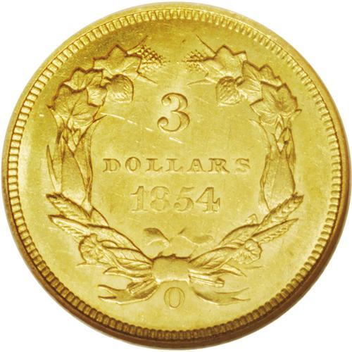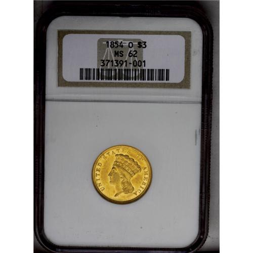<B>1854-O<$3> MS62 NGC.</B></I> Breen-6349. This issue, the only New Orleans Mint three dollar, is readily available in lower grades, scarce in AU, and incredibly elusive in Mint State. A search through Heritage's auction records reveals that this is only the seventh time in the last dozen years or more that we have offered a Mint State specimen, most of them in MS60 or MS61. This piece is tied at the top of the heap with another MS62 NGC piece that we offered way back in 1994. Our records of other major auctions show only a single other appearance of an MS62 coin, in a Stack's auction from May 1994. This piece is clearly in the Condition Census of certified pieces: NGC has graded three pieces in MS62, with none higher, while the highest PCGS-graded example is a sole specimen in MS61 (5/06). The Bass Collection specimens were AU58 and AU55 examples, for purposes of further comparison.<BR> This problem-free piece shows luscious and lustrous reddish-gold surfaces, with no singularly mentionable abrasions, just light field chatter consistent with the grade. There are two varieties, this being the more lightly impressed of the two. On the obverse, only portions appear of the JBL initials on the bust truncation, and S OF is weak. The 85 in the date is weak. Die lapping on the reverse has erased portions of the bowknot, the leaf left of the date, and the right bow ribbons, but the mintmark is fairly strong. <I>Coin World</B></I>'s monthly <I>Coin Values</B></I> publication shows a value of $30,000 for this largely unheralded, yet unimprovable rarity.<BR><I>From The Alpine Zephyr Collection.</B></I> <BR><BR><B>Importan