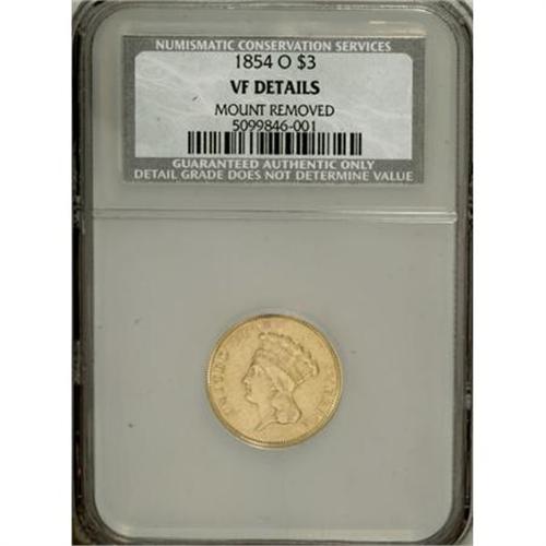 <B>1854-O $3 --Mount Removed--NCS. VF Details.</B></I> No mount is obvious, but the fields are cloudy and the devices are somewhat blurry from polishing. Thin obverse abrasions are consistent with former use as jewelry. Only 24,000 pieces were struck for this sole O-mint issue.<BR><BR><B>Coin Engraver:</B> James B. Longacre<BR><BR><b>Shipping:</b> Coins & Currency (<a target="_blank" href="http://www.heritageauctions.com/common/shipping.php">view shipping information</a>)