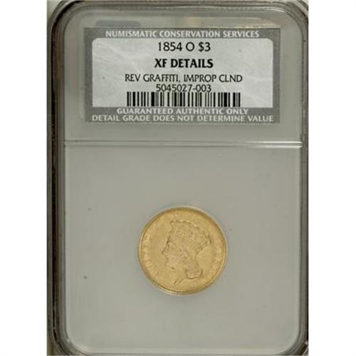 <B>1854-O $3 --Reverse Graffiti, Improperly Cleaned--NCS. XF Details.</B></I> NGC Census: (65/521). PCGS Population (63/263). Mintage: 24,000. Numismedia Wsl. Price for NGC/PCGS coin in XF40: $2,450. (#7971)<BR><BR><B>Coin Engraver:</B> James B. Longacre<BR><BR><b>Shipping:</b> Coins & Currency (<a target="_blank" href="http://www.heritageauctions.com/common/shipping.php">view shipping information</a>)