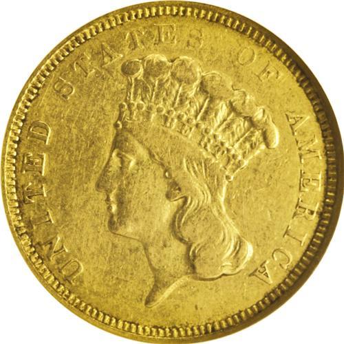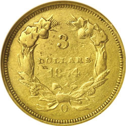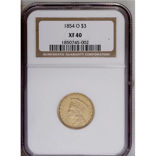 <B>1854-O<$3> XF40 NGC.</B></I> A collectible example of the sole O-mint three dollar gold piece. Luster emerges from design recesses when this subdued straw-gold coin is rotated beneath a light. Surprisingly void of marks, aside from a minor pinscratch on the base of the U in UNITED. The 5 in the date is softly impressed, as it is opposite the highpoint of the prominent portrait.