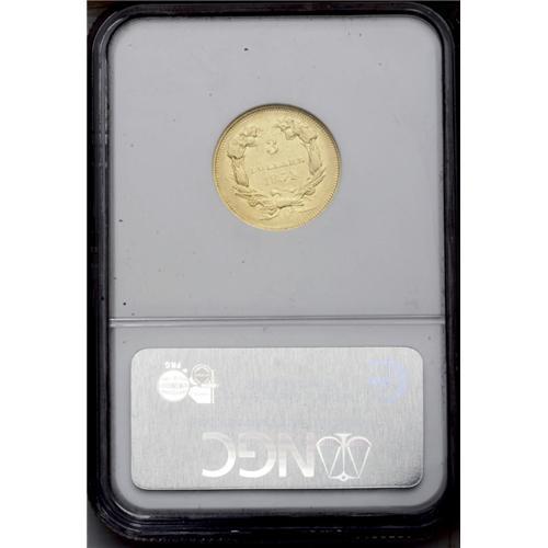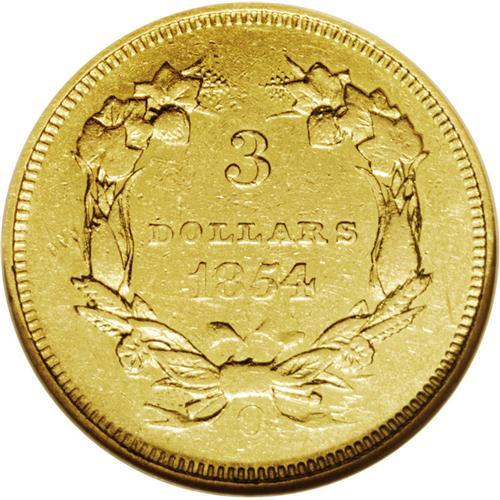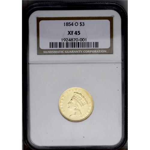 <B>1854-O<$3> XF45 NGC.</B></I> Light yellow-gold surfaces exhibit a hint of tan color. A few minor surface marks are visible on both sides including some small marks at the center of the reverse. As usual, the lower reverse is weakly defined. Very few issues of this denomination were produced at the branch mints, and this 1854 issue is the only date of the denomination struck in New Orleans. This is an important consideration for the collector of New Orleans Mint type coins.