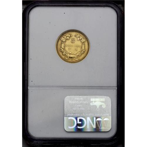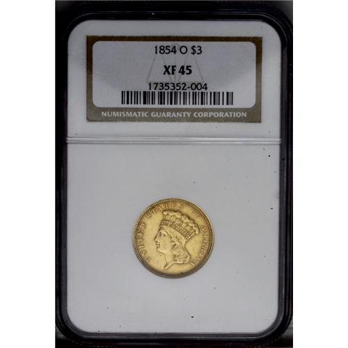 <B>1854-O<$3> XF45 NGC.</B></I> The only readily collectible first-year branch mint three dollar gold issue, and highly popular as such. This piece shows pretty yellow-gold centers with copper-gold peripheries; some faded mint luster still clings. There are no major abrasions, although the central strike is typically weak. The beginning of a die crack extends from the right ribbon toward the rim at 4 o'clock.<BR><I>From The Steve Glenn Collection.</B></I> <BR><BR><B>Important notice:</B> Heritage usually auctions material at the rate of 200-250 lots per hour. On some occasions eBay Live bid software or the Internet may not be able to keep up with the pace of the auction. We recommend placing a realistic absentee bid now as insurance to avoid disappointment. Occasionally the auctioneer may eliminate or reject an eBay Live bid, and the auctioneer may also reopen a lot after the close of the eBay live bidding (usually because we missed an audience bid), and may reject your bid even if it shows you as the winning bidder. By bidding via eBay Live, you agree that Heritage may award the lot to another bidder at its sole discretion under the circumstances described above or any other reasonable circumstances. Since eBay bids are not shown to us until we open the lot on the floor, we treat those bids just like floor bids. In most cases the floor responds before the eBay bid is presented to us, due to Internet lag time, so for consistency we have made it a policy that floor bids are always considered first over tie eBay live bids. Also please note that all Heritage lots purchased through eBay Live carry a 20% Buyer's Premium. Please make sure you read the Terms and Conditions before you bid. This lot is being auctioned in conjunction with a live floor auction by Heritage Galleries & Auctioneers. All final auction and invoice information will be supplied by Heritage Galleries & Auctioneers, and all other information should be considered preliminary. Lot:2556 <BR><BR><B>Winning Notification and Billing:</B> After the FINAL session in this auction is complete, Heritage will send e-mail and snail mail invoices. This process normally takes several days. All final auction and invoice information will be supplied by Heritage Galleries & Auctioneers, and all other information should be considered preliminary. <BR><BR>This auction will be conducted on a live auction floor and over the Internet through eBay Live. If you choose to place an absentee bid, please take a moment to <font color='#0000ff'><u><a href='http://pages.ebay.com/liveauctions/help/before/laabsentee.html'>learn how eBay Live absentee bidding works</a></u></font><font color='#000000'>