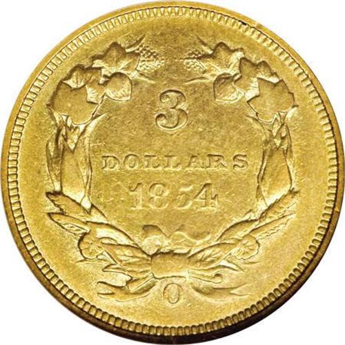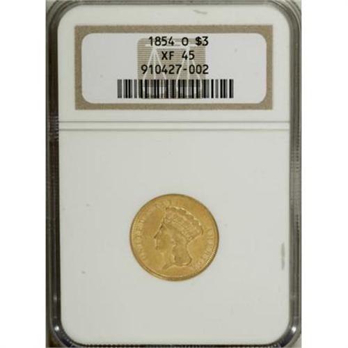 <B>1854-O $3 XF45 NGC.</B></I> A doubly popular coin, as the first year of issue and the only O-mint piece in the series, the 1854-O is generally available, despite its low mintage, as long as one stays away from the Mint State realm. This specimen offers untroubled peach-gold surfaces that retain considerable luster and are somewhat prooflike.<BR><BR><B>Coin Engraver:</B> James B. Longacre<BR><BR><b>Shipping:</b> Coins & Currency (<a target="_blank" href="http://www.heritageauctions.com/common/shipping.php">view shipping information</a>\)
