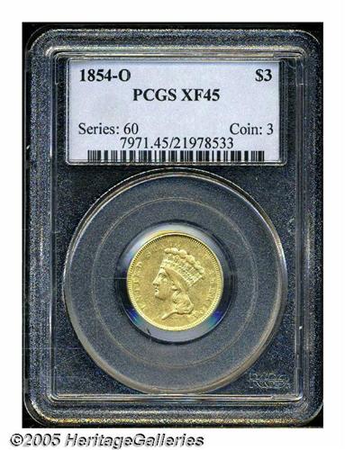 <B>1854-O<$3> XF45 PCGS.</B></I> Even, light orange color and typical surfaces for the grade. The present example still retains the faintest hints of luster in the obverse legends and has high eye appeal for the grade.
