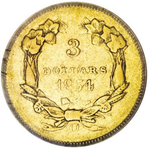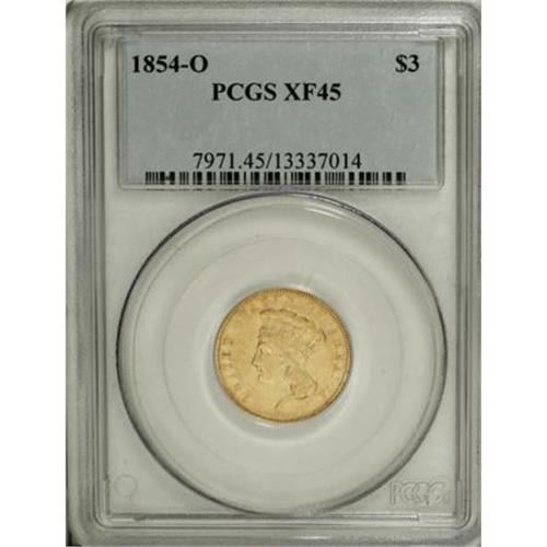 <B>1854-O $3 XF45 PCGS.</B></I> Olive green-gold surfaces are very clean and free of imperfections deserving of individual mention. A solid example of the only New Orleans three dollar gold piece. The date is a bit weak, as is typically seen, but fully readable and some luster is seen in the areas most protected from wear.<BR><BR><B>Coin Engraver:</B> James B. Longacre<BR><BR><b>Shipping:</b> Coins & Currency (<a target="_blank" href="http://www.heritageauctions.com/common/shipping.php">view shipping information</a>)