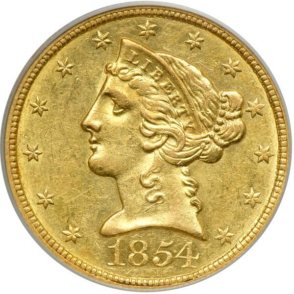 1854-O. PCGS graded AU-55 CAC Approved. P.Q. Some luster still evident. Semi-reflective fields. Only 46,000 struck. Pop 16; 17 finer (PCGS # 8259) .
