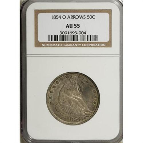 <B>1854-O 50C Arrows AU55 NGC.</B></I> NGC Census: (48/280). PCGS Population (53/222). Mintage: 5,240,000. Numismedia Wsl. Price for NGC/PCGS coin in AU55: $300. (#6280)<BR><BR><B>Coin Engraver:</B> Christian Gobrecht<BR><BR><b>Shipping:</b> Coins & Currency (<a target="_blank" href="http://www.heritageauctions.com/common/shipping.php">view shipping information</a>)