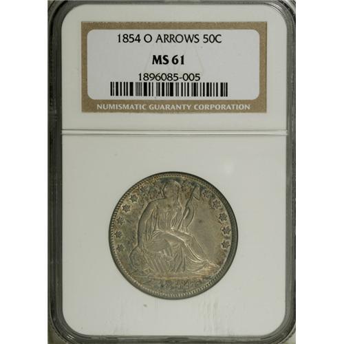 <B>1854-O 50C Arrows MS61 NGC.</B></I> The gold-gray surfaces have strong luster beneath thin patina. Well struck and lightly abraded with royal-blue accents at the rims.<BR><BR><b>Shipping:</b> Coins & Currency (<a target="_blank" href="http://www.heritageauctions.com/common/shipping.php">view shipping information</a>)