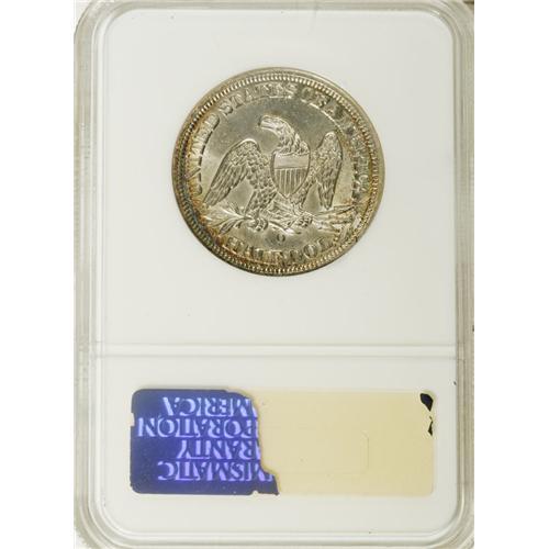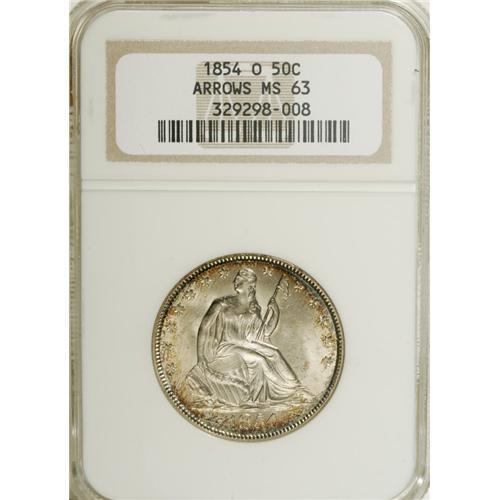 <B>1854-O 50C Arrows MS63 NGC.</B></I> Bright luster enlivens each side of this New Orleans issue, which is complemented by crisply stuck motifs. Wisps of cobalt-blue, gold-brown, and lavender hug the rim areas. Some minute marks preclude an even higher grade.<BR><BR><b>Shipping:</b> Coins & Currency (<a target="_blank" href="http://www.heritageauctions.com/common/shipping.php">view shipping information</a>)