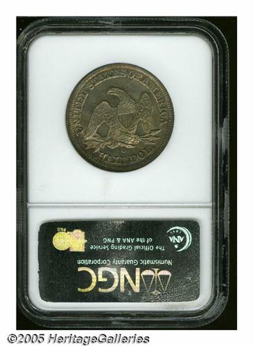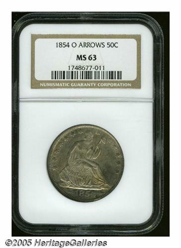 <B>1854-O<50C> Arrows MS63 NGC.</B></I> Mottled violet and dark orange colors grace the somewhat matte lustrous surfaces of this example. Some light striations in the obverse left field are noted, but in general this piece is very well preserved.