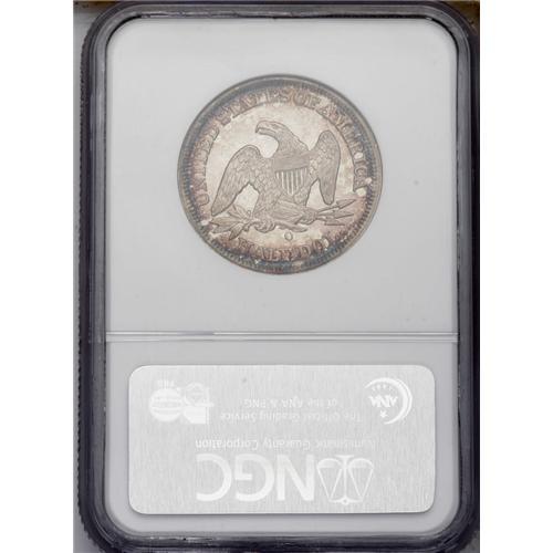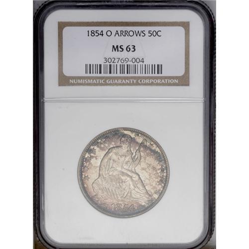<B>1854-O<50C> Arrows MS63 NGC.</B></I> The design elements are nicely brought up, and lavender and electric-blue toning assumes a dappled pattern on the obverse and a more even distribution on the reverse. A minute mark is seen on Liberty's cheek, and a few wispy marks are visible in the right (facing) obverse field.<BR><I>From The Frank DuVall Collection.</B></I>