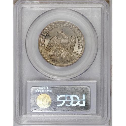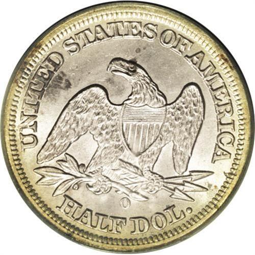 <B>1854-O<50C> Arrows MS64 PCGS.</B></I> Normal Date. A common date, the 1854-O was minted to the extent of more than 5 million examples. According to the Wiley-Bugert Seated half reference, 55 head dies and 33 tail dies were used for the total emission. Heavy die cracks are seen on the obverse of this variety, which is quite scarce according to Seated half specialist Dick Osburn. Moderate amounts of steel-gray toning are accented with golden-blue highlights, particularly on the reverse. Well defined, even at this late obverse die state. An important branch mint example of this short-lived design type.