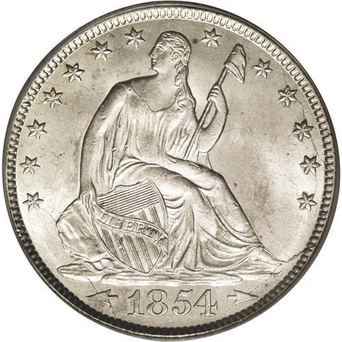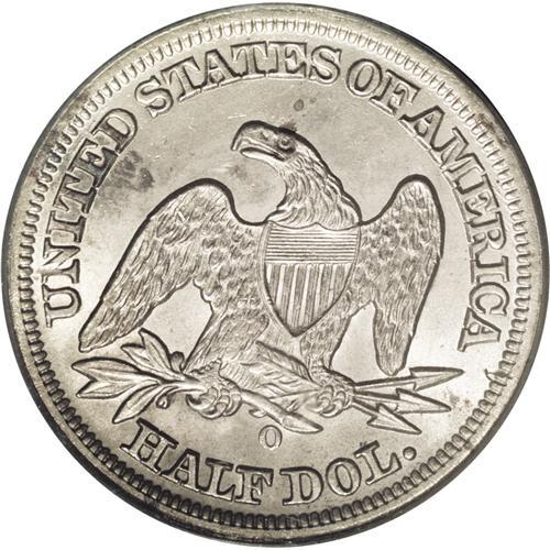 <B>1854-O<50C> Arrows MS64 PCGS.</B></I> Normal Date. Heavy die cracks are seen on the obverse. Moderate amounts of steel-gray toning are accented with golden blue highlights, particularly on the reverse. Well defined, even at this late obverse die state. An important branch mint example of this short-lived design type.