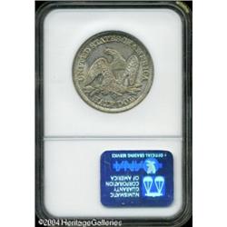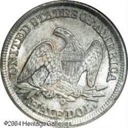 1854-O 50C Arrows MS67 NGC. Doubled Date, 54 touch <B>1854-O 50C Arrows MS67 NGC.</B></I> Doubled Date, 54 touch. Breen-4852. One would be hard pressed to find a more original representative of this important Seated Half Dollar type, and examples that rival it in technical quality are also rare. The strike is among the strongest that we have seen on an 1854-O Arrows Half. Every feature (the obverse star centrils and the eagle's right leg on the reverse included) is fully brought up, this despite a shattered obverse die as evidenced by numerous cracks (as produced) around the periphery. There is a reverse die break (also as struck) through the top of the eagle's head to the D of UNITED. Blushes of powder-blue and orange-russet patina are sprinkled over otherwise silver-gray surfaces. Fully frosted with remarkably smooth and abrasion-free features for the issue as well as the type. A faint and certainly not distracting obverse planchet streak (as struck) over and before Liberty's legs is noted for pedigree purposes. Population: 1 in 67, 2 finer (11/04). <BR><BR><B>Important notice:</B> Heritage usually auctions material at the rate of 200-250 lots per hour. On some occasions eBay Live bid software or the Internet may not be able to keep up with the pace of the auction. We recommend placing a realistic absentee bid now as insurance to avoid disappointment. Occasionally the auctioneer may eliminate or reject an eBay Live bid, and the auctioneer may also reopen a lot after the close of the eBay live bidding (usually because we missed an audience bid), and may reject your bid even if it shows you as the winning bidder. By bidding via eBay Live, you agree that Heritage may award the lot to another bidder at its sole discretion under the circumstances described above or any other reasonable circumstances. Since eBay bids are not shown to us until we open the lot on the floor, we treat those bids just like floor bids. In most cases the floor responds before the eBay bid is presented to us, due to Internet lag time, so for consistency we have made it a policy that floor bids are always considered first over tie eBay live bids. Also please note that all Heritage lots purchased through eBay Live carry a 20% Buyer's Premium. Please make sure you read the Terms and Conditions before you bid. This lot is being auctioned in conjunction with a live floor auction by Heritage Galleries & Auctioneers. All final auction and invoice information will be supplied by Heritage Galleries & Auctioneers, and all other information should be considered preliminary. Lot:6094
