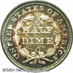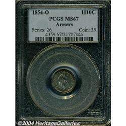 <B>1854-O<H10C> Arrows MS67 PCGS.</B></I> This is an important companion piece to the 1853-O half dime offered above. This is the finest 1854-O half dime certified by PCGS, and to date is the only example of this issue to receive the Superb Gem MS67 grade. During nearly two decades in the grading business, PCGS has only certified six With Arrows half dimes in MS67, four dated 1853 and one each dated 1853-O and 1854-O. Both of these branch mint coins are offered to collectors today!<BR> This Superb Gem has satiny luster beneath iridescent toning. The obverse has lilac and sea-green color at the center, gradually changing to pale yellow and pink near the border. On the reverse, the central area inside the wreath is pale gold, the wreath device and all lettering are ivory, and the outer fields are lilac, rose, and pale blue. This presentation of colors is exciting and is sure to please any collector. This is an extremely important opportunity for the specialized half dime or Liberty Seated collector. <BR><BR><B>Important notice:</B> Heritage usually auctions material at the rate of 200-250 lots per hour. On some occasions eBay Live bid software or the Internet may not be able to keep up with the pace of the auction. We recommend placing a realistic absentee bid now as insurance to avoid disappointment. Occasionally the auctioneer may eliminate or reject an eBay Live bid, and the auctioneer may also reopen a lot after the close of the eBay live bidding (usually because we missed an audience bid), and may reject your bid even if it shows you as the winning bidder. By bidding via eBay Live, you agree that Heritage may award the lot to another bidder at its sole discretion under the circumstances described above or any other reasonable circumstances. Since eBay bids are not shown to us until we open the lot on the floor, we treat those bids just like floor bids. In most cases the floor responds before the eBay bid is presented to us, due to Internet lag time, so for consistency we have made it a policy that floor bids are always considered first over tie eBay live bids. Also please note that all Heritage lots purchased through eBay Live carry a 20% Buyer's Premium. Please make sure you read the Terms and Conditions before you bid.