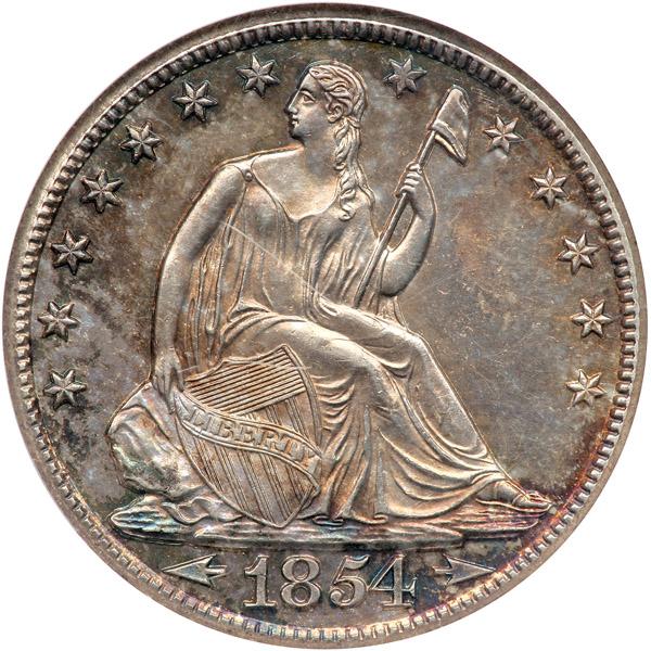 1854-O Liberty Seated Half Dollar. Arrows. NGC graded Specimen 63. A needle sharp strike with full mirrored fields, all, overlaid with lovely natural golden and mottled blue toning. Popular first year of the arrows type. Pop 1; the only example graded "Specimen."