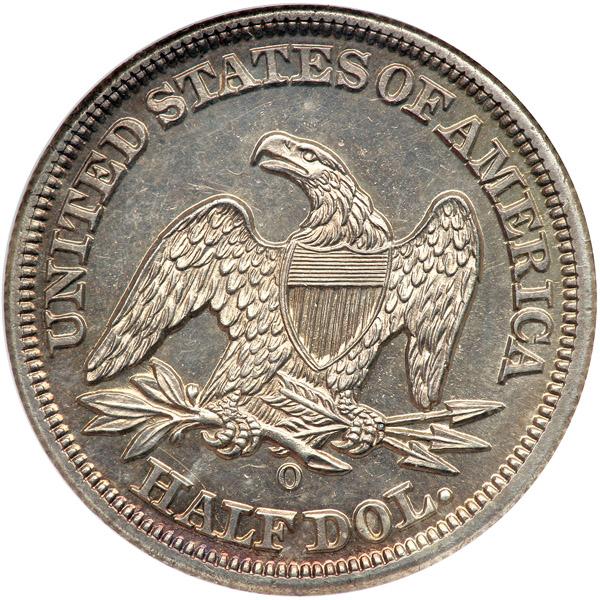 According to the Heritage Auctions cataloger of this Specimen 63 example in the 2008 A.N.A. sale catalog, "To our knowledge this is the only Proof striking of the 1854-O half dollar. We were able to trace the pedigree of this unique piece through Breen's brief mention of it on page 235 of his 1977 Proof Encyclopedia: 'Date slants up to r., 54 touch. Reed Hawn:183, $1,300, unverified.' Examination of the photo of Reed's coin in the Stack's catalog and this piece positively identify this as the coin from his historic offering of half dollars. The description in the Stack's catalog in 1973 was succinct and unambiguous: 'A magnificent Brilliant Proof, with full glittering surface even in the stripes of the shield on the reverse. There is no doubt that this is a specimen striking, not only because of its mirror surface, but also because of the perfection of strike. A lovely coin with pale russet and golden toning.'