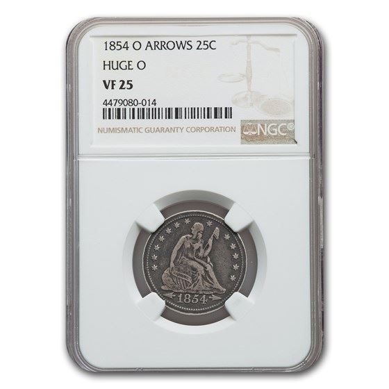 One piece 1854-O Liberty Seated Quarter VF-25 NGC (Huge O, Arrows)
