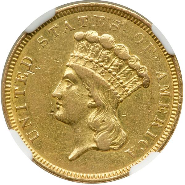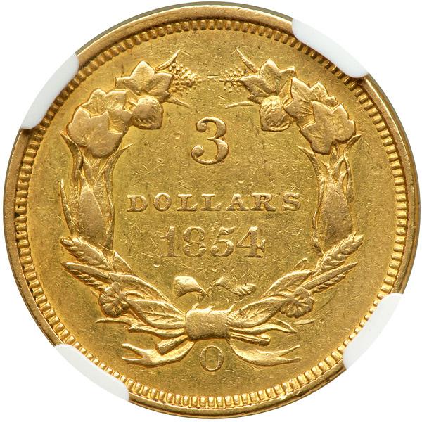 1854-O NGC graded AU Details. Obverse damage. Only 24,000 pieces struck. The only "O" mint $3 Gold coin. Lightly toned; a few random field marks consistent with this grade. Scarce. The $3 denomination, which was rarely popular with the public, continued to be issued in small numbers until 1889 when the denomination was eliminated along with the gold dollar and nickel three-cent piece (PCGS # 7971) .