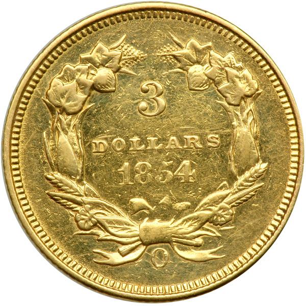 1854-O NGC graded AU Details. Polished. Only 24,000 struck for this New Orleans mint $3 Gold Coin (PCGS # 7971) .