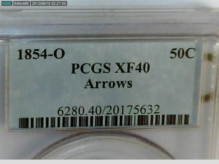 1854 O SEATED LIBERTY HALF DOLLAR. PCGS CERTIFIED XF40. PCGS CERT #20175632. COIN HAS SOME MODERATE DARK TONING. IT IS A GREAT LOOKING COIN!