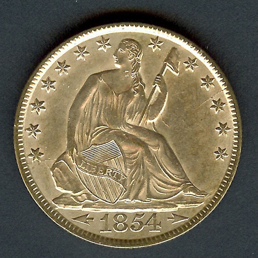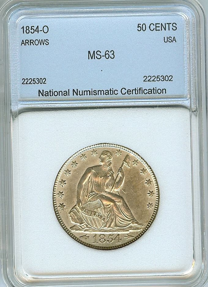 1854-O SEATED LIBERTY SILVER 50 CENTS WITH ARROWS AT DATE NNC MS63