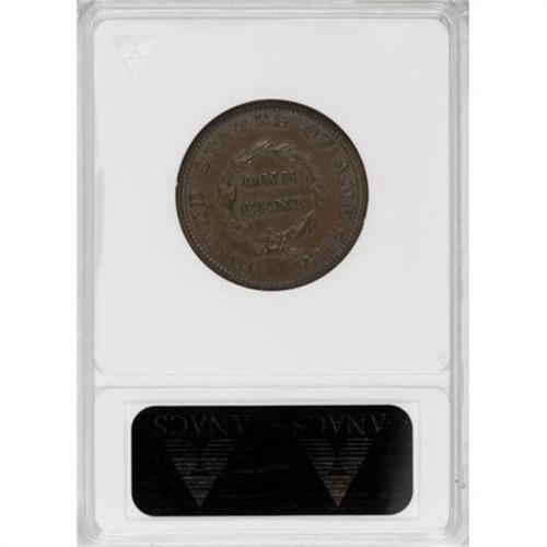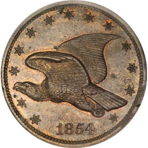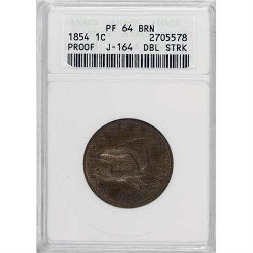 <B>1854 P1C Flying Eagle Cent--Double Struck--Judd-164 Original, Pollock-189, R.5, PR64 Brown ANACS.</B></I> Flying eagle design with a hook-neck eagle on the obverse, surrounded by stars and the date below. The reverse closely resembles the regular dies issue for the large cent. Struck in either copper or bronze with a plain edge.<BR> This is the second example of a double struck Judd-164 we have seen. The other was in our 2003 ANA Sale. At first it seemed it must be the same coin. However, there are a couple of spots that do not match that piece. The description of the doubling exactly matches the coin from five years ago: "It appears that the reverse was struck from a misaligned die. ... Most of the evidence of the first strike was obliterated but traces of the lettering still can be seen in several places, most notably on UNITED STATES OF AMERICA. ONE CENT also shows evidence of having been struck twice, and there is slight doubling on several of the leaves in the wreath." <BR> The brown surfaces show a slight overlay of blue, most notably on the reverse. The identifying spots on this piece are located below the eagle's beak, behind the trailing wing, and next to star 7. <BR> <BR><BR><b>Shipping:</b> Coins & Currency (<a target="_blank" href="http://www.heritageauctions.com/common/shipping.php">view shipping information</a>)