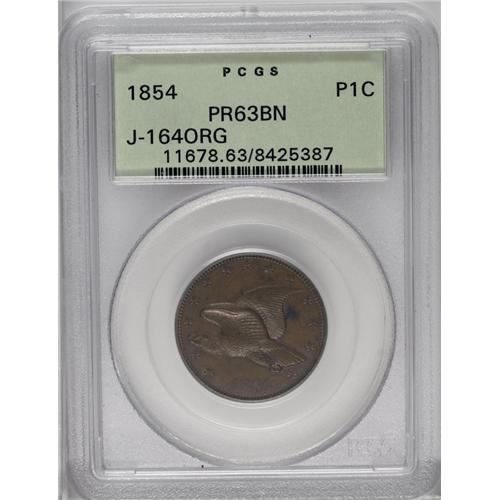 <B>1854<P1C> Flying Eagle Cent, Judd-164 Original, Pollock-189, R.5, PR63 Brown PCGS.</B></I> Flying eagle design with a hook-neck eagle on the obverse, surrounded by stars and the date below. The reverse closely resembles the regular dies issue for the large cent, although the wreath and letters are smaller. Struck in either copper or bronze with a plain edge. This appealing specimen delivers strong detail throughout and glimpses of faded red color. A rather large carbon spot to the right of the eagle precludes a Choice rating.<BR><I>From The Steve Glenn Collection.</B></I> <BR><BR><B>Important notice:</B> Heritage usually auctions material at the rate of 200-250 lots per hour. On some occasions eBay Live bid software or the Internet may not be able to keep up with the pace of the auction. We recommend placing a realistic absentee bid now as insurance to avoid disappointment. Occasionally the auctioneer may eliminate or reject an eBay Live bid, and the auctioneer may also reopen a lot after the close of the eBay live bidding (usually because we missed an audience bid), and may reject your bid even if it shows you as the winning bidder. By bidding via eBay Live, you agree that Heritage may award the lot to another bidder at its sole discretion under the circumstances described above or any other reasonable circumstances. Since eBay bids are not shown to us until we open the lot on the floor, we treat those bids just like floor bids. In most cases the floor responds before the eBay bid is presented to us, due to Internet lag time, so for consistency we have made it a policy that floor bids are always considered first over tie eBay live bids. Also please note that all Heritage lots purchased through eBay Live carry a 20% Buyer's Premium. Please make sure you read the Terms and Conditions before you bid. This lot is being auctioned in conjunction with a live floor auction by Heritage Galleries & Auctioneers. All final auction and invoice information will be supplied by Heritage Galleries & Auctioneers, and all other information should be considered preliminary. Lot:1812 <BR><BR><B>Winning Notification and Billing:</B> After the FINAL session in this auction is complete, Heritage will send e-mail and snail mail invoices. This process normally takes several days. All final auction and invoice information will be supplied by Heritage Galleries & Auctioneers, and all other information should be considered preliminary. <BR><BR>This auction will be conducted on a live auction floor and over the Internet through eBay Live. If you choose to place an absentee bid, please take a moment to <font color='#0000ff'><u><a href='http://pages.ebay.com/liveauctions/help/before/laabsentee.html'>learn how eBay Live absentee bidding works</a></u></font><font color='#000000'>