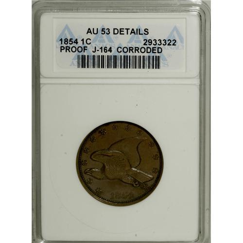 <B>1854 P1C Flying Eagle Cent, Judd-164 Original, Pollock-189, R.5.--Corroded--ANACS. AU53 Details.</B></I> The hook-necked flying eagle design surrounded by stars and the date below. The reverse closely resembles the regular dies issue for the large cent, although the wreath and letters are smaller, as is the diameter. Struck in bronze with a plain edge. The lightly worn reddish-brown and mocha-colored surfaces are laced with blue. The lower right wreath displays some weakness, and a patch of active corrosion is noted below and around the eagle's talons.<BR><I>From The Dale A. Konigsburg Collection, Part Two.</B></I><BR><BR><b>Shipping:</b> Coins & Currency (<a target="_blank" href="http://www.heritageauctions.com/common/shipping.php">view shipping information</a>)