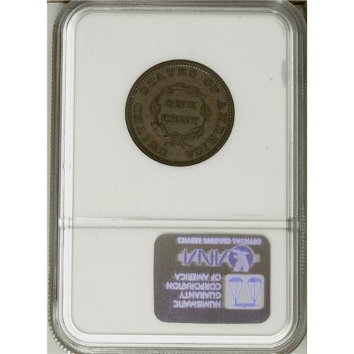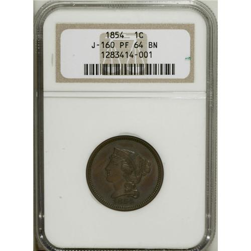 <B>1854 P1C One Cent, Judd-160, Pollock-187, R.4, PR64 Brown NGC.</B></I> The obverse shows Liberty with a braided hair design and the date below, all in a plain field. The reverse has a small laurel wreath around the denomination ONE CENT with the exterior legend UNITED STATES OF AMERICA. Struck in copper with a plain edge. The moderately reflective brown surfaces show an accent of faint blue around the devices. An interesting, long oval-shaped strike-through is seen on the left part of Liberty's face and into the left field, possibly the outline of a thread that fell on the die at the time of striking.<BR><I>Ex: Stack's Sale # 26 (2/25/39), lot 47, where it brought $4.50.</B></I><BR><I>From The Jones Beach Collection.</B></I><BR><BR><b>Shipping:</b> Coin/Currency (<a target="_blank" href="http://www.heritageauctions.com/common/shipping.php">view shipping information</a>)
