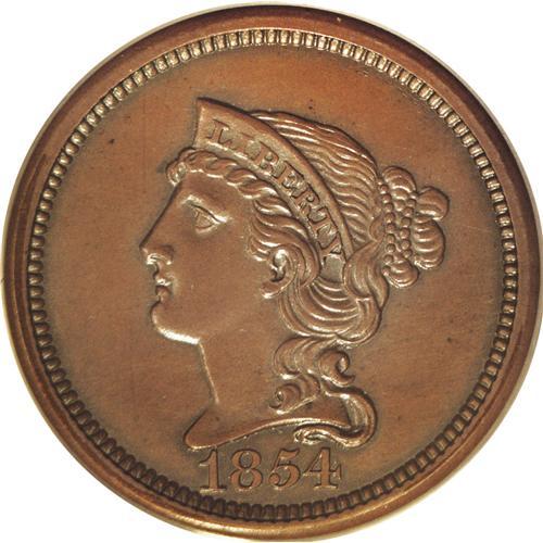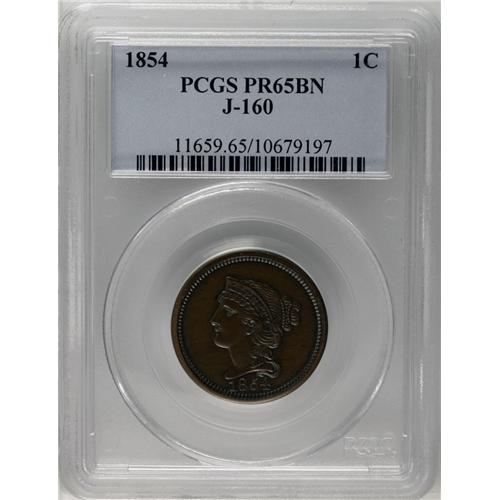 <B>1854<P1C> One Cent, Judd-160, Pollock-187, R.4, PR65 Brown PCGS.</B></I> The obverse is similar to that used on regular issue 1854 cents, except there are no stars. The denomination is centered on the reverse within a laurel wreath, and the legend UNITED STATES OF AMERICA is around the periphery. Struck in copper or bronze with a plain edge. This is a glossy brown example that has moderately reflective mirrors in the fields and surfaces that are problem-free overall as well as carbon-free.<BR><I>Ex: John L. Harris Collection (Stack's, 11/50), lot 77.</B></I><BR><I>From The Redfjord Collection.</B></I>