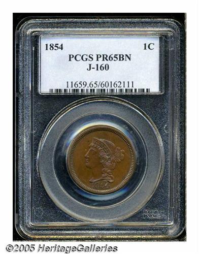 <B>1854<P1C> One Cent, Judd-160, Pollock-187, R.4, PR65 Brown PCGS.</B></I> The obverse is similar to that used on regular issue 1854 cents, except that there are no stars. The denomination is centered on the reverse within a laurel wreath, and the legend UNITED STATES OF AMERICA is around the periphery. Struck in copper or bronze with a plain edge. The surfaces are a pleasing reddish-brown with strong lilac-red toning over the obverse portrait, and glimmering deep-purple toning near the reverse center.<BR><I>From The Western Hills Collection.</B></I>