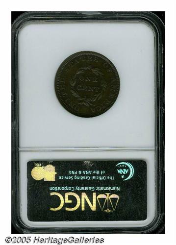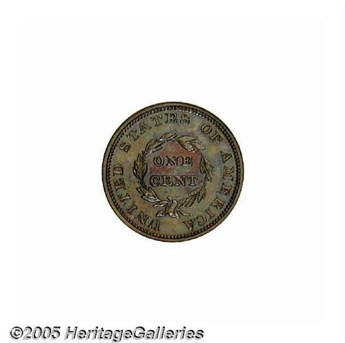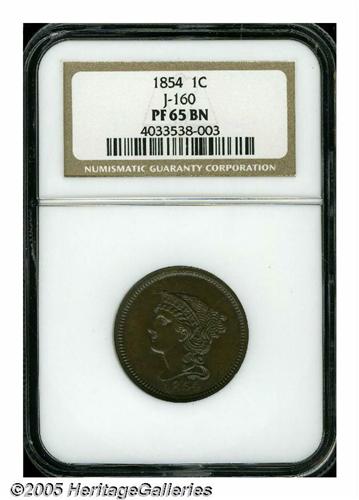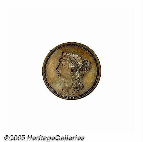 <B>1854<P1C> One Cent, Judd-160, Pollock-187, R.4, PR65 Brown NGC.</B></I> The obverse is similar to that used on regular issue 1854 cents, except there are no stars. The denomination is centered on the reverse within a laurel wreath, both smaller than on contemporary cents, and the legend UNITED STATES OF AMERICA is around the periphery. Struck in copper or bronze with a plain edge. This is outstanding quality for this issue, a pattern that is <I>normally</B></I> found with subdued or lackluster proof surfaces. The present example is a splendid exception, a Gem with superb eye appeal. The fields are mirrored and reflective with deep brown coloration and iridescent toning. Traces of original orange mint color are visible.