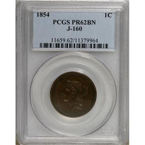 <B>1854 P1C One Cent, Judd-160, Pollock-187, R.4, PR62 Brown PCGS.</B></I> The designs are similar to the contemporary large cent, but there are no stars, and the diameter is smaller. Struck in bronze with a plain edge. A beautiful medium brown example of this interesting and collectible pattern. Close study with a loupe locates faint obverse field hairlines.<BR><BR><b>Shipping:</b> Coins & Currency (<a target="_blank" href="http://www.heritageauctions.com/common/shipping.php">view shipping information</a>)