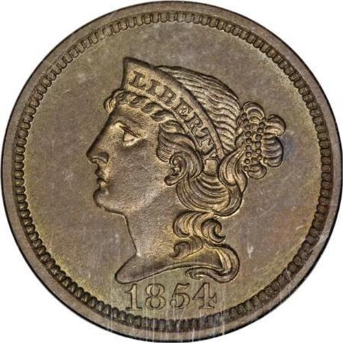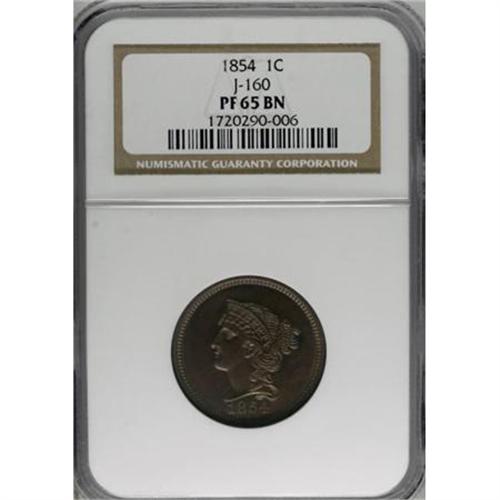 <B>1854 P1C One Cent, Judd-160, Pollock-187, R.4, PR65 Brown NGC.</B></I> The obverse shows Liberty with a braided hair design and the date below, all in a plain field. The reverse has a small laurel wreath around the denomination ONE CENT with the exterior legend UNITED STATES OF AMERICA. Struck in copper with a plain edge. The head of Liberty is set off in medal-like fashion on the obverse. The fields are deeply mirrored and flash forcefully through the brown patina that covers each side.<BR><BR><b>Shipping:</b> Coins & Currency (<a target="_blank" href="http://www.heritageauctions.com/common/shipping.php">view shipping information</a>)