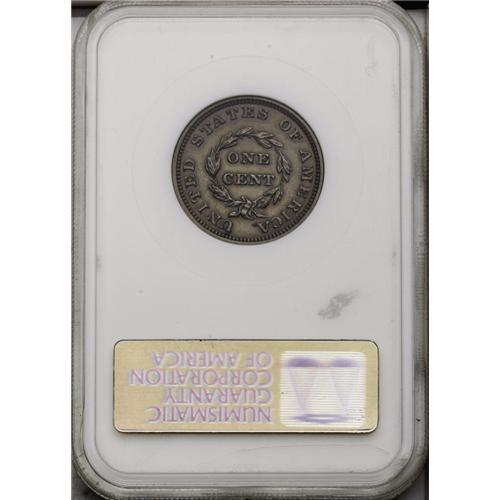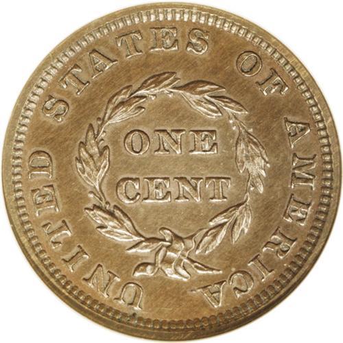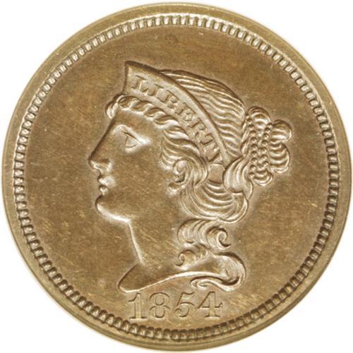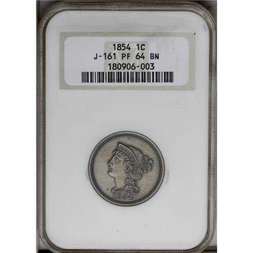 <B>1854<P1C> One Cent, Judd-161 Original, Pollock-187, R.4, PR64 Red and Brown NGC.</B></I> Reduced size and starless large cent with the obverse showing the head of Liberty wearing a diadem inscribed LIBERTY, the reverse depicts ONE CENT in a small laurel wreath. Struck in bronze with a plain edge. A crisply struck specimen with blended chocolate-brown and dark-green colors. A faint die clash mark is noted on the upper reverse, just to the right of E in ONE, but the surfaces are undisturbed by contact or improper handling.