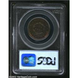 1854 P1C One Cent, Judd-161 Original, Pollock-187, R.4, PR64 Brown PCGS. The design is similar to that on production large Cents except there are no stars on the obverse, and the diameter is smaller. Struck in copper with a plain edge. The fields are brightly reflective with deep brown and olive patina over each side. This otherwise Gem coin is downgraded by a shallow scratch in front of Liberty's neck. Important notice: We expect to be auctioning lots at the rate of 200-250 per hour. Sometimes eBay Premier live bid software cannot keep up with that pace, so we strongly recommend that you place a realistic proxy bid now as insurance to avoid disappointment. Also please note that all Heritage/CAA lots purchased through eBay Premier carry a 20% Buyer's Premium. Please make sure you read the Terms and Conditions.