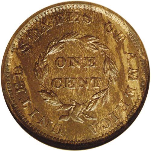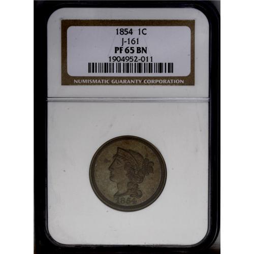 <B>1854<P1C> One Cent, Judd-161 Original, Pollock-187, R.4, PR65 Brown NGC.</B></I> Reduced size Large cent with the obverse showing the head of Liberty wearing a diadem inscribed LIBERTY and no stars around the periphery, while the reverse depicts ONE CENT in a small laurel wreath and two leaves beneath the E in STATES. Struck in bronze with plain edge. Slight streakiness is seen over each side, and the reverse displays striking weakness on the wreath. Glossy overall with significant underlying reflectivity. <BR><BR><B>Important notice:</B> Heritage usually auctions material at the rate of 200-250 lots per hour. On some occasions eBay Live bid software or the Internet may not be able to keep up with the pace of the auction. We recommend placing a realistic absentee bid now as insurance to avoid disappointment. Occasionally the auctioneer may eliminate or reject an eBay Live bid, and the auctioneer may also reopen a lot after the close of the eBay live bidding (usually because we missed an audience bid), and may reject your bid even if it shows you as the winning bidder. By bidding via eBay Live, you agree that Heritage may award the lot to another bidder at its sole discretion under the circumstances described above or any other reasonable circumstances. Since eBay bids are not shown to us until we open the lot on the floor, we treat those bids just like floor bids. In most cases the floor responds before the eBay bid is presented to us, due to Internet lag time, so for consistency we have made it a policy that floor bids are always considered first over tie eBay live bids. Also please note that all Heritage lots purchased through eBay Live carry a 20% Buyer's Premium. Please make sure you read the Terms and Conditions before you bid. This lot is being auctioned in conjunction with a live floor auction by Heritage Galleries & Auctioneers. All final auction and invoice information will be supplied by Heritage Galleries & Auctioneers, and all other information should be considered preliminary. Lot:1811 <BR><BR><B>Winning Notification and Billing:</B> After the FINAL session in this auction is complete, Heritage will send e-mail and snail mail invoices. This process normally takes several days. All final auction and invoice information will be supplied by Heritage Galleries & Auctioneers, and all other information should be considered preliminary. <BR><BR>This auction will be conducted on a live auction floor and over the Internet through eBay Live. If you choose to place an absentee bid, please take a moment to <font color='#0000ff'><u><a href='http://pages.ebay.com/liveauctions/help/before/laabsentee.html'>learn how eBay Live absentee bidding works</a></u></font><font color='#000000'>