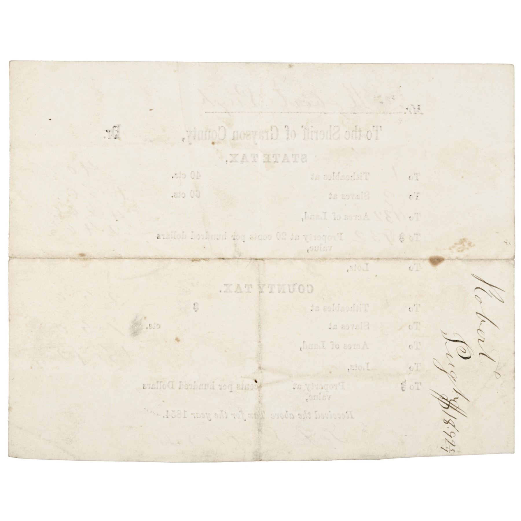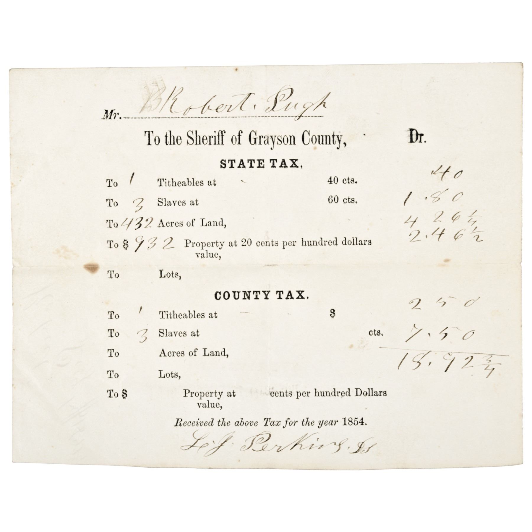 This original, Property Tax Receipt for the year 1854 measures 5” x 6.75” printed in black on bright crisp wove period paper. “To the Sheriff of Grayson County,  Dr.” A receipt of $18.92 3/4 from Mr. Robert Pugh for both State and County Taxes for “1 Titheable, ...3 Slaves, $932 Property ... and 432 Acres of Land,” and Signed at bottom.  Interesting to note the smaller amount of State tax on the Slaves and Titheables versus the County’s take.  A scarce Partially-Printed Official Receipt For Taxes Paid On Slaves.