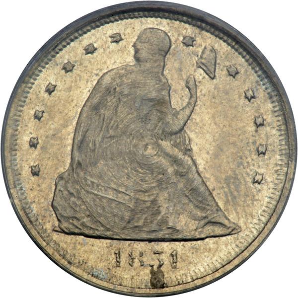 1854 Pattern Cent. German silver, reeded edge. Judd-156. Pollock-185. High Rarity 7. PCGS graded Proof 65 CAC Approved. Interesting to note the engine turned markings on the obverse device. James C. Booth, the Melter and Assayer, suggested to Mr. Snowden, the Director of the Mint, that cents could be made out of German silver in a size between the dime and the quarter and a little thicker than a dime. In submitting pieces for examination on January 17, 1854, he reported that these were prepared solely to show the size and the character of the metal, not the design. In fact the obverse die was prepared by a copying lathe from a silver dollar obverse. This fact explains the concentric lines blurring the design of Liberty, the distortion of the stars and the incompleteness of the numerals in the date. Pop 1; none finer (PCGS # 11648) .