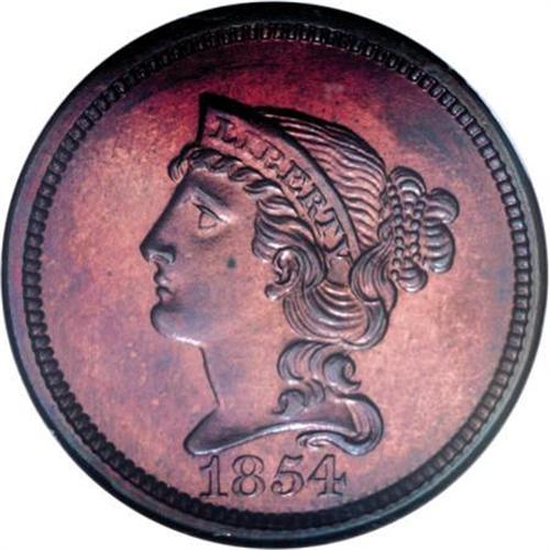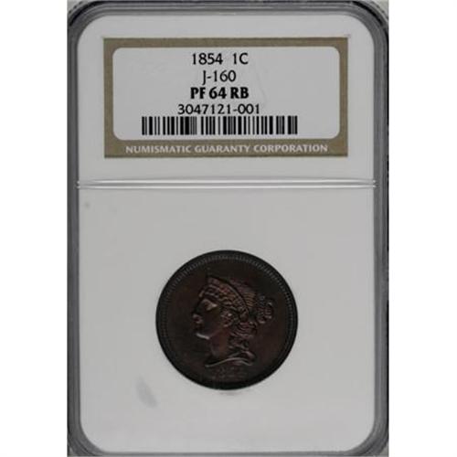 <B>1854 P1C One Cent, Judd-160, Pollock-187, R.4, PR64 Red and Brown NGC.</B></I> Part of the Mint's experiments with a smaller diameter cent, the design is similar to the contemporary large cent but omits the stars and shrinks the wreath. Struck in bronze with a plain edge. The base of the 1 is lightly repunched. Dusky rose-red and apple-green with a small spot on the cheekbone.<BR><BR><b>Shipping:</b> Coins & Currency (<a target="_blank" href="http://www.heritageauctions.com/common/shipping.php">view shipping information</a>\)